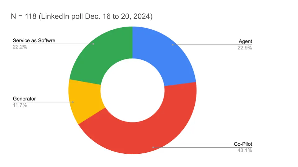 Agents and Service as Software ran about equal. The agent approach, or agentic AI, is being heavily promoted by Salesforce and attracted a lot of attention at the end of 2024. Service as Software is a more holistic approach that combines generators, agents and in some cases co-pilots to replace professional services provided by skilled humans with AIs. Accounting and legal services are often used as examples, but virtually all services are candidates for disruption.