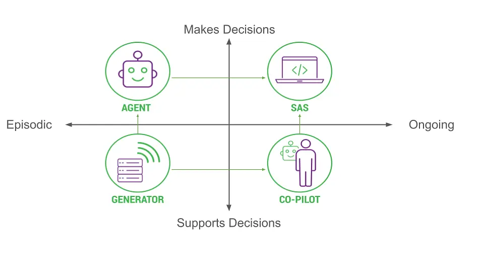 These four patterns are not independent of each other. In fact all are based on Generators and both Agents and Co-Pilots can be integrated into Service as Software. The design space for B2B generative AI applications can be organized along two dimensions: time (episodic or ongoing) and autonomy (supports decisions or makes decision).