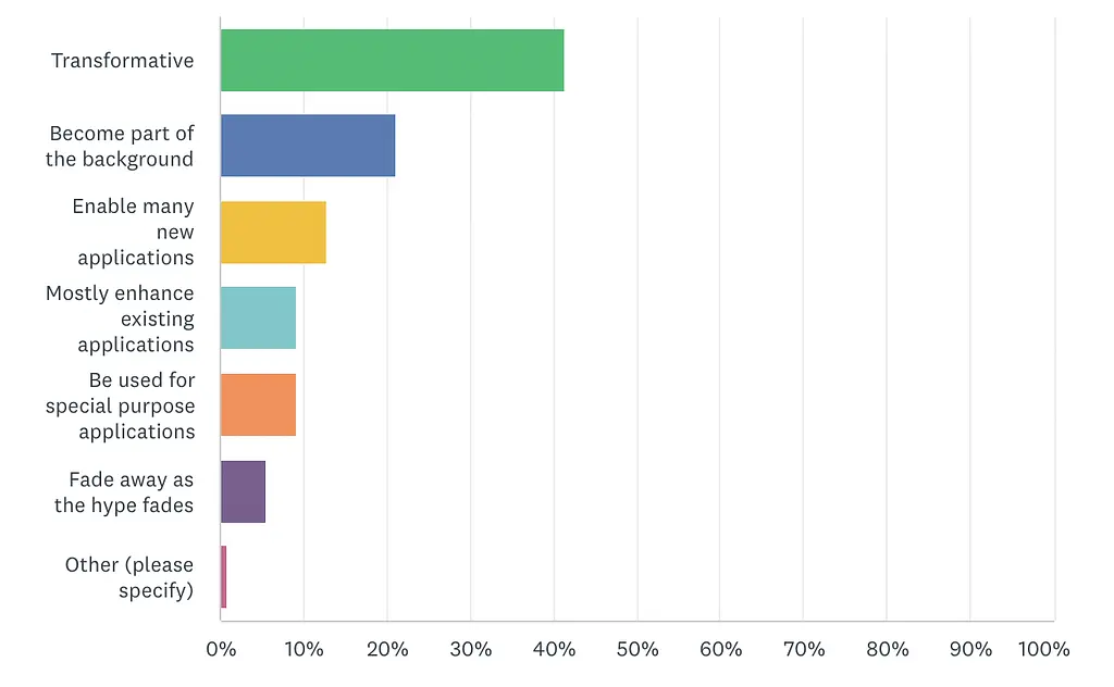 Most of the respondents believe that generative AI is transformative. Of course, this is a highly skewed data set. It is for people interested in attending a roundtable on generative AI. It does not represent the general population, or even the general technical population or business population.