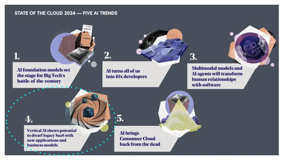 One of the big trends in generative AI is the move to vertical applications. In its State of the Cloud 2024 Bessemer Venture Partners called out Five Trends shaping AI.