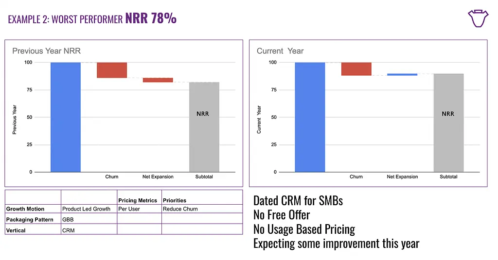 This company offers a CRM solution to SMBs (Small and Medium Businesses) and has NRR of only 78%. This means that if no new customers are added the company will be gone in less than five years. Note that this company had significant churn, at 18%, and that revenue among those customers that were staying was going down by 4% per year.