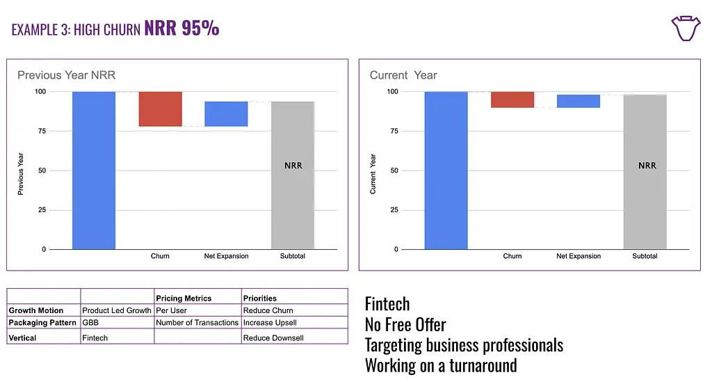 This Fintech (financial technology) company has the tools it needs to manage NRR. It has a hybrid pricing model, pricing is per user and per number of transactions, and there are four packages in its tiered pricing model (Good, Better, Best, and Enterprise).