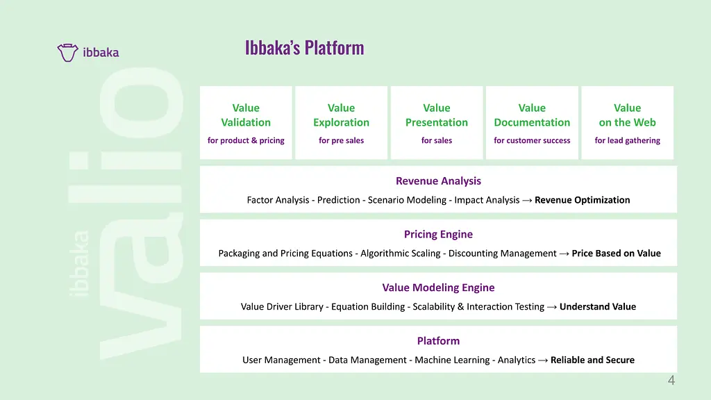 Ibbaka is built on value modeling. At the heart of our approach is the use of value models to understand and connect key business processes, from product and pricing, through presales and sales, to customer success. This is how we have structured the Ibbaka Platform.