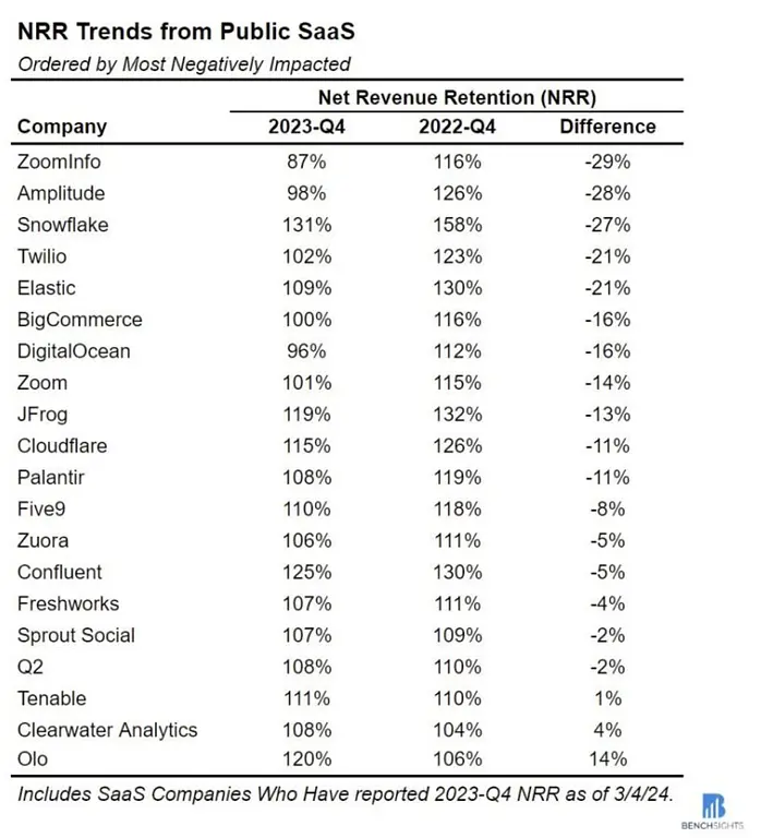 More importantly, all of these companies had NRR of more than 100% in Q4 2022. In Q4 2023 three companies fell below the critical threshold of 100%.