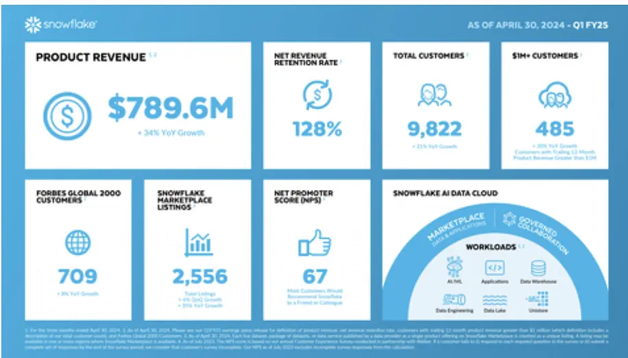 There are still some stellar performers here. Snowflake may have seen a large decline in NRR, but this is from a very high level of 158% and on substantial revenues. In Q1 FY 2025 NRR was down to 128% (a drop of 3 percentage points from the number reported by BenchSights) on quarterly revenue of just under $790 million.