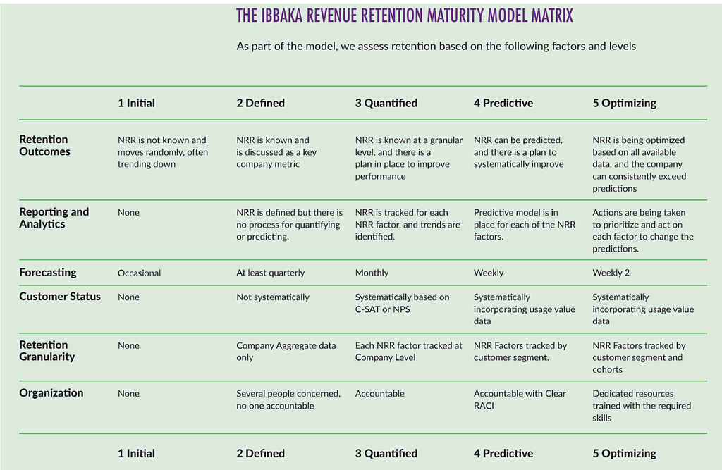 The model spans 6 factors our research has found to be crucial factors in NRR performance and covers five levels of maturity with each level representing a step toward a more sophisticated and effective revenue retention strategy.