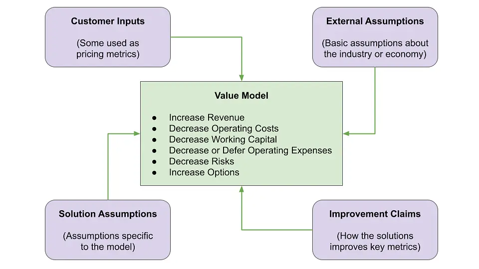 Sometimes in order to build the value model you have to make assumptions outside the customer x solution interaction. These range from macroeconomic factors (interest rates, energy prices, labour rates come to mind) to competitors (the Next Best Competitive Alternative in the Economic Value Estimation approach). Having these called out as variables in the model helps monitor them and run different scenarios.