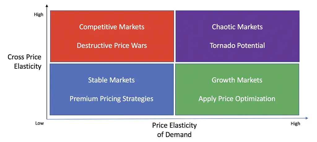 Cross price elasticity and price elasticity of demand interact to create four typical market dynamics. You can read more about this here: Understand your market's dynamics before you set your pricing strategy.