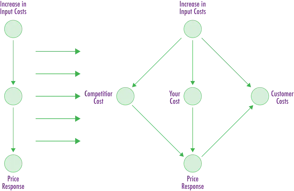 Neglecting to consider the impact of cost increases on competitors is a recipe for failure. It's imperative to inquire, "How does the cost increase affect my competitors?" Without understanding this, it's impossible to anticipate how competitors might respond to any price adjustments you make.