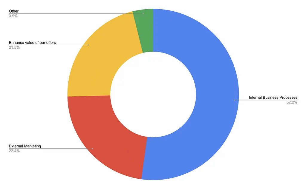 Not surprisingly, the most common application was internal business processes. Given the variety of generative AI applications, this is not surprising. Some of the applications we have seen include …