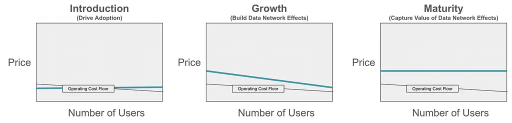 One of the challenges in pricing generative content AIs is to balance the value brought in by users through data network effects with the cost of operating (not building) a generative AI application. The desire to have more users contributing more content pushes prices lower while the operating costs set a floor to responsible pricing. At the same time, the value goes up with the number of users (the network effect) and at some point it makes sense to start increasing prices to reflect the growing valu. One will likely see pricing curves evolve over time.