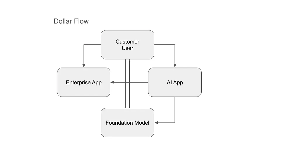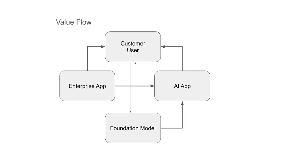 The data comes from the customer and the foundation model. Customer data runs through a cycle from customer to enterprise app to AI agent or app, where it is enriched with one or more foundation models and then fed back to the customer. These cycles lead to conflict about who is really creating the value and how much of that value each participant can claim. We could make this picture even more complicated by adding a direct connection between the customer and the foundation model.