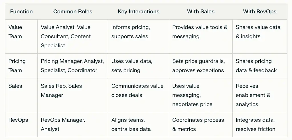 What are the common roles on a value team (the team responsible for understanding, communicating, and documenting value)? What are the most common roles on a pricing team? How do these two business functions interact? How do they interact with Sales and RevOps?