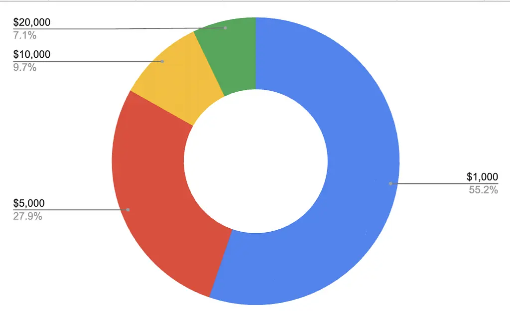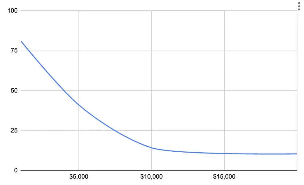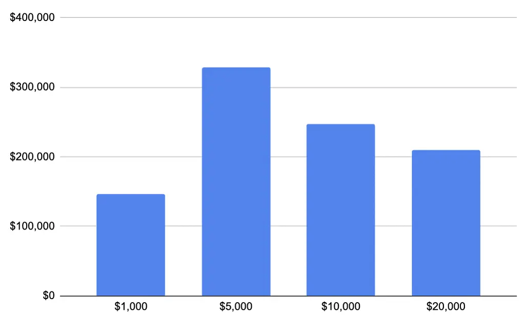Before anyone looks at the above graph and concludes that the right price is $1,000 per month (already 5X lift over the $200 per month Pro subscription take a look at the below graph. The revenue optimizing price would be $5,000 per month with $10,000 and $20,000 far outperforming the $1,000 price point. This is for revenue optimization, pricing for profit optimization would be different again.