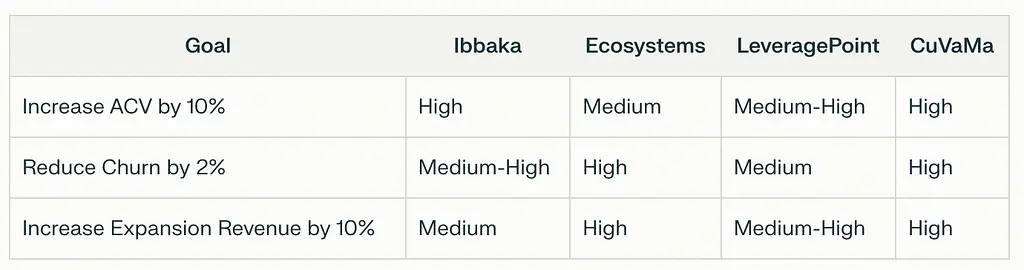LeveragePoint offers an excellent value-to-price ratio but may not provide as comprehensive a solution as needed for the company's requirements. Ecosystems has strong potential for reducing churn and increasing expansion revenue but comes at a higher price point. CuVaMa, while potentially powerful, appears to be significantly overpriced based on the available information.