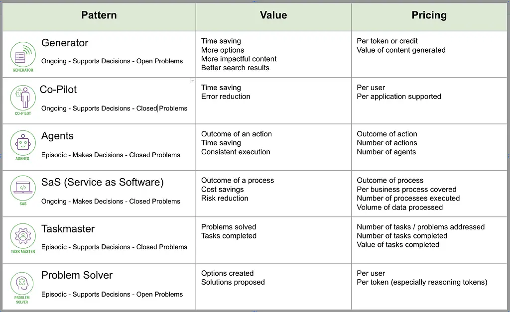 Each of these patterns has implications for value modeling and pricing design. The following table is a summary. It is interesting to note that the only patterns that are likely to use conventional per user pricing are Co-Pilots (where the pricing is often tied to the underlying application that is being supported, which is most often per user) and the Problem Solver, which is one of the main ways the reasoning models will be used directly.