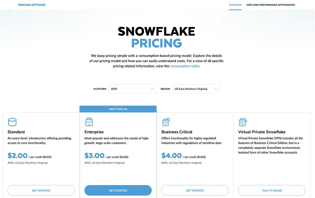 Snowflake is one of the classic examples of credit-based pricing. Basically, you buy credits and use them to pay for services. Snowflake offers its levels of service and four levels of pricing. The price credits are fenced by the types of service you can use to buy with the credit, where the credits can be used, and other variables.